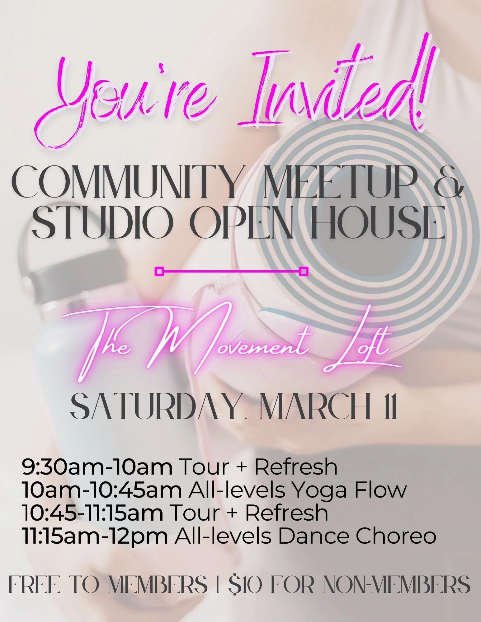 You’re invited on March 11 to get to know your Movement Loft community, while enjoying fun all-levels friendly classes, meeting our instructors and wellness team, snacking on healthy refreshments and making connections.